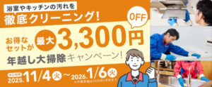 ┏━┓┏━┓┏━┓┏━┓┃大┃┃掃┃┃除┃┃!┃┗━┛┗━┛┗━┛┗━┛o○ .。+o● .。+o○ .。+o● .年越し大掃除キャンペーン!\最大6,600円OFF/◆浴室+キッチン 39,600円→37,400円◆浴室+換気扇 39,600円→37,400円◆浴室+追い炊き 45,100円→38,500円◆浴室+換気扇+キッチン 59,400円→55,000円しかも!換気扇+キッチンセットをご注文のお客様!キッチン天板のお手入れ簡単コーティングが無料に!キャンペーン期間2025年11月4日~1月6日までo○ .。+o● .。+o○ .。+o● .お申し込み方法